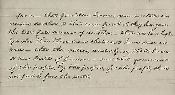 "Fourscore and seven years ago our fathers brought forth, on this continent, a new nation, conceived in liberty, and dedicated to the proposition that all men are created equal. Now we are engaged in a great civil war, testing whether that nation, or any nation so conceived, and so dedicated, can long endure. We are met on a great battle-field of that war. We have come to dedicate a portion of that field, as a final resting-place for those who here gave their lives, that that nation might live. It is altogether fitting and proper that we should do this. But, in a larger sense, we cannot dedicate, we cannot consecrate—we cannot hallow—this ground. The brave men, living and dead, who struggled here, have consecrated it far above our poor power to add or detract. The world will little note, nor long remember what we say here, but it can never forget what they did here. It is for us the living, rather, to be dedicated here to the unfinished work which they who fought here have thus far so nobly advanced. It is rather for us to be here dedicated to the great task remaining before us—that from these honored dead we take increased devotion to that cause for which they here gave the last full measure of devotion—that we here highly resolve that these dead shall not have died in vain—that this nation, under God, shall have a new birth of freedom, and that government of the people, by the people, for the people, shall not perish from the earth."